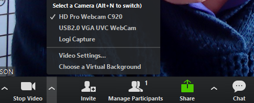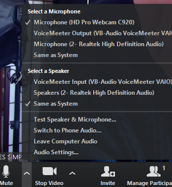 If you click on ‘Mute’ icon or’ Video’ Icon you can access settings and different mics or cameras if you have them.